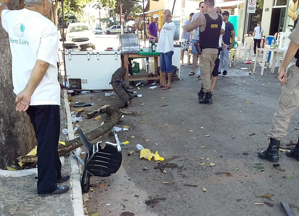 Segundo a Polícia Militar, vítima estava em uma mesa na feira de artesanato e alimentação. Defesa Civil informou que a árvore é da espécie gameleira e não apresentava sinais de risco de queda.