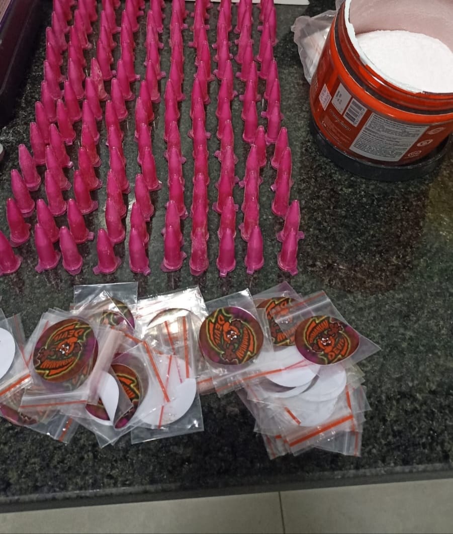 Após o conjunto de evidências da propriedade do veículo e de materiais escondidos em seu interior, foi realizada uma busca veicular, sendo localizado 140 pinos contendo substância semelhante a cocaína, um pote plástico contendo grande quantidade de pó esbranquiçado semelhante a cocaína, uma munição intacta calibre .22; duas balanças de precisão; duas pistolas de pressão; um pote contendo grande quantidade de esfera/munição 4mm; um liquidificador utilizado para refinar cocaína, estando o copo com resquícios de pó branco; aproximadamente três mil pinos vazios usados para embalar cocaína e várias embalagens personalizas utilizadas para embalo de drogas sintéticas.