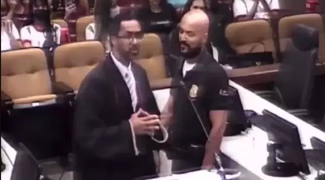 O desembargador ordenou, então, que o advogado se retirasse do plenário. Além de se recusar a sair, Tiago Jonas Aquino ainda deu voz de prisão em flagrante ao presidente da Corte por desacato, (Asissta ).