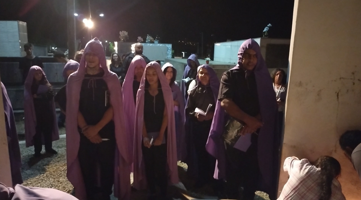 “O grupo permanece do início ao final do trajeto em silêncio profundo, com pausas apenas para cantar e rezar, além de tocar matracas e berra-bois. O encerraramento do ritual foi realizado dentro do Cemitério São Miguel, onde cantaram, acenderam velas e rezaram pelas almas do purgatório, almas de familiares e amigos falecidos”.