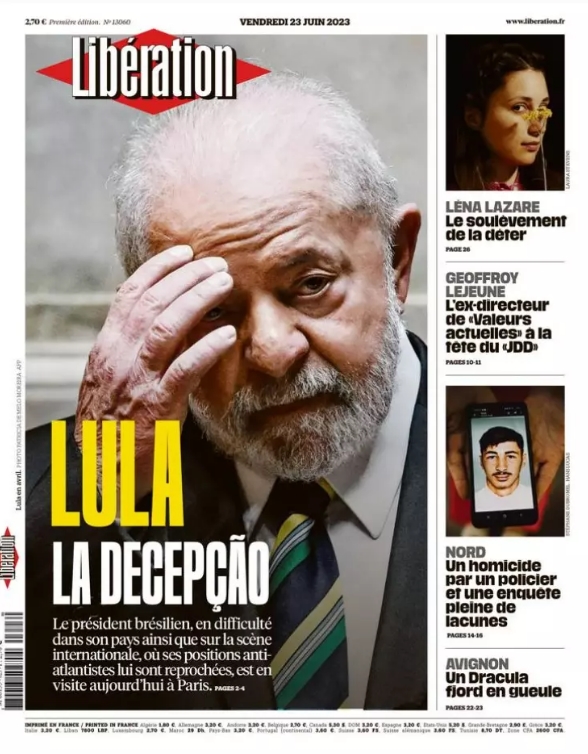 O jornal francês Libération estampa foto do presidente Luiz Inácio Lula da Silva (PT) na capa em sua edição imprensa desta sexta-feira (23), com o título: “Lula, a decepção”. O periódico escreve que o presidente brasileiro tem “dificuldade tanto em seu país quanto no cenário internacional, onde lhe são recriminadas suas posições antiatlantistas“, se referindo às declarações de Lula em relação à guerra na Ucrânia nas quais não criticou explicitamente a Rússia pela invasão. “O presidente brasileiro não é o precioso aliado que imaginávamos, especialmente quando se trata de ostracizar o novo pária do Ocidente: a Rússia, culpada de uma invasão intolerável da Ucrânia”, diz o jornal. Lula está em visita oficial à França, desde esta quinta-feira (21). Ele já se reuniu com o presidente francês Emmanuel Macron e participa nesta manhã da cúpula do evento Um Novo Pacto Financeiro Global.