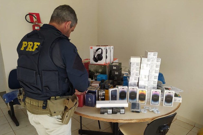 Dos 254 itens apreendidos destacam-se 43 celulares, sendo alguns iPhones 14, 1 drone, bebidas e perfumes.
