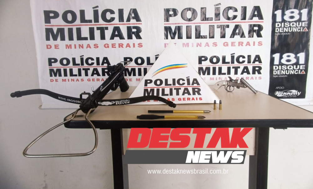 Durante a vistoria na casa, os militares encontraram e apreenderam uma garrucha, calibre .22, duas munições do mesmo calibre, uma balestra (besta) e duas flechas. O armamento, mantido sem autorização legal, configura crime previsto no Estatuto do Desarmamento.