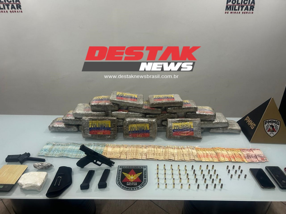 Entorpecentes: 23 barras de maconha e uma porção avulsa da droga, identificada com a etiqueta "Colombian Gold", indicando uma variação de maior potência no mercado ilícito; e uma barra de cocaína.