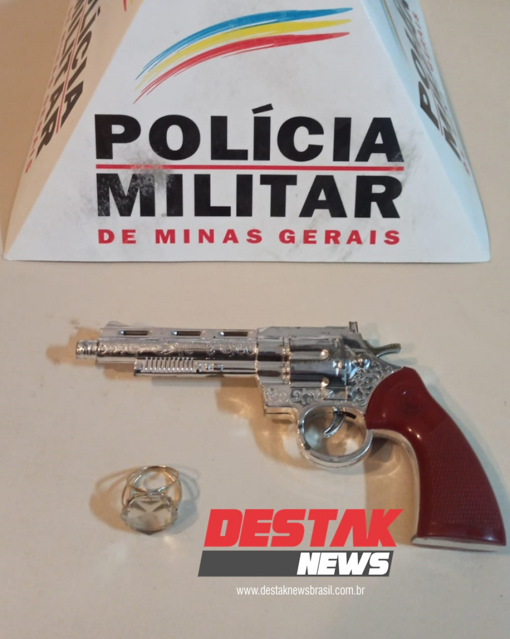 Um simulacro de arma de fogo (réplica de revólver), utilizado para intimidar a vítima.