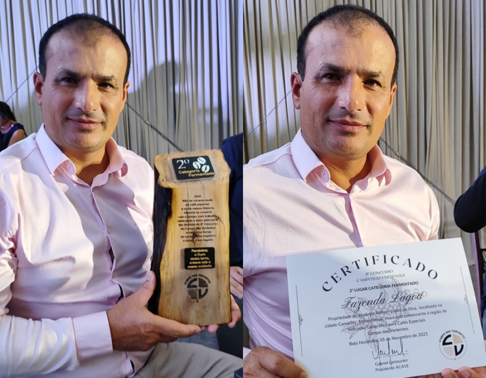 Belo Horizonte/MG – A Fazenda Lagoa, localizada no município de Camacho (MG), e de propriedade dos cafeicultores Adilson Lopes da Silva, Amilton Lopes da Silva e Anderleia, conquistou um prestigioso 2º lugar na categoria de Café Fermentado durante a 8ª edição do Concurso Campo das Vertentes. A celebração e entrega dos prêmios, que reconheceu os melhores cafés da região da Indicação Geográfica (IG), ocorreu em uma cerimônia de gala na noite da última quarta-feira (5), no Palácio da Liberdade, em Belo Horizonte (MG).