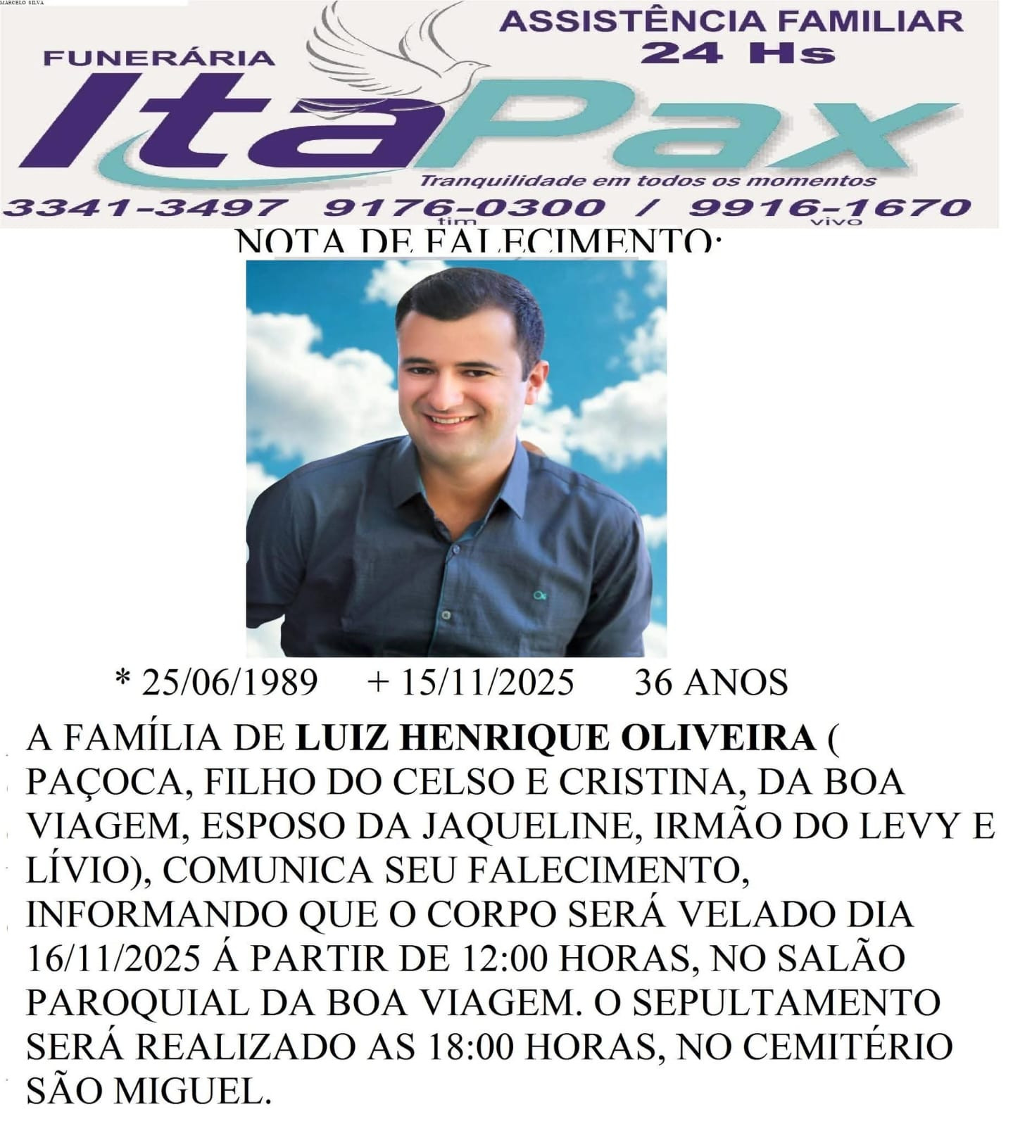 A Funerária Itapax informou os detalhes do velório e sepultamento de Luiz Henrique de Oliveira: