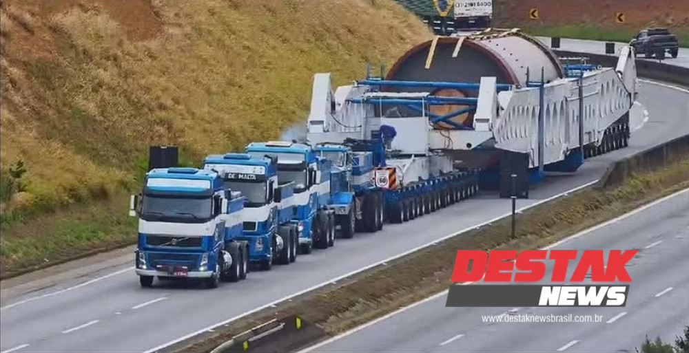 Trata-se de uma carreta especial, um verdadeiro comboio rodoviário, que alcança a impressionante marca de mais de 123 metros de comprimento e ostenta um peso total estimado em aproximadamente 600 toneladas. A carga colossal é composta por um sistema de moagem de alto valor e complexidade, com destino final ao município de Edealina, no Estado de Goiás.