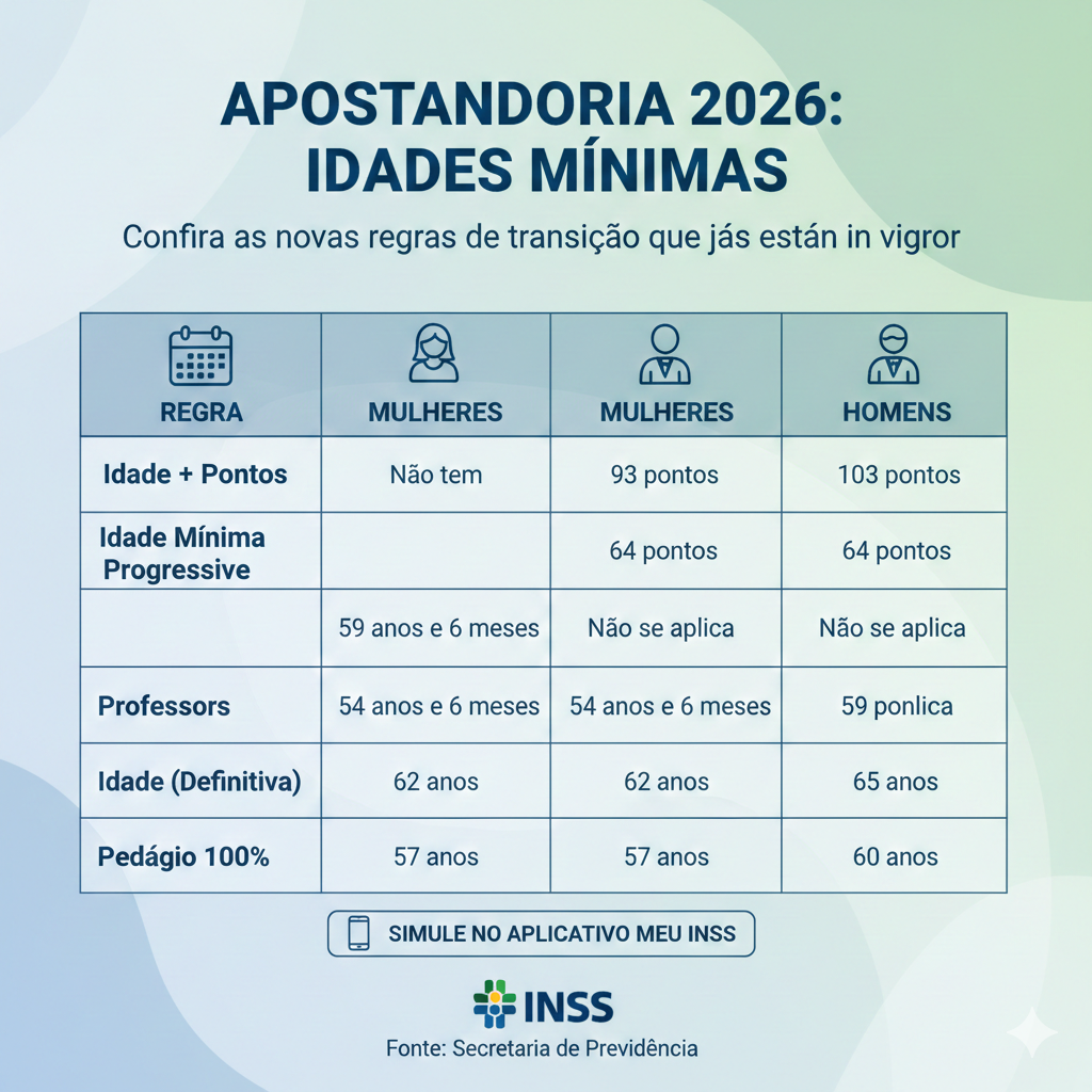 | Gênero | Idade Mínima em 2026 | Tempo de Contribuição |