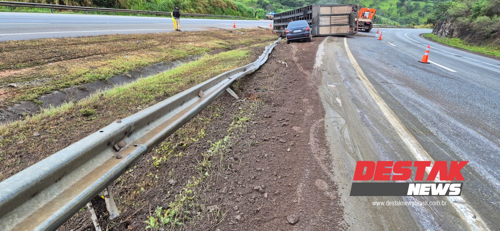Ao entrar em uma curva, o motorista, um homem de 57 anos, perdeu o controle direcional do veículo. A carreta acabou tombando sobre o canteiro central que divide as pistas. Com o impacto, a estrutura da carga foi danificada, permitindo que parte dos animais se soltasse.