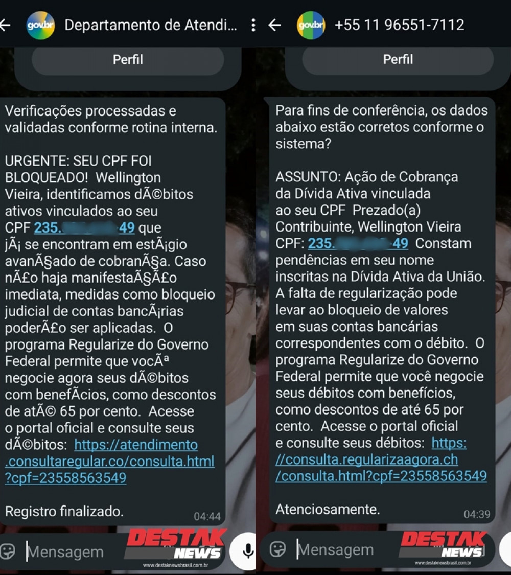 O conteúdo geralmente afirma que o destinatário possui uma Dívida Ativa, que seu CPF ou CNPJ será cancelado ou que suas contas bancárias serão bloqueadas. Ao final, é oferecido um link para uma suposta "regularização imediata".