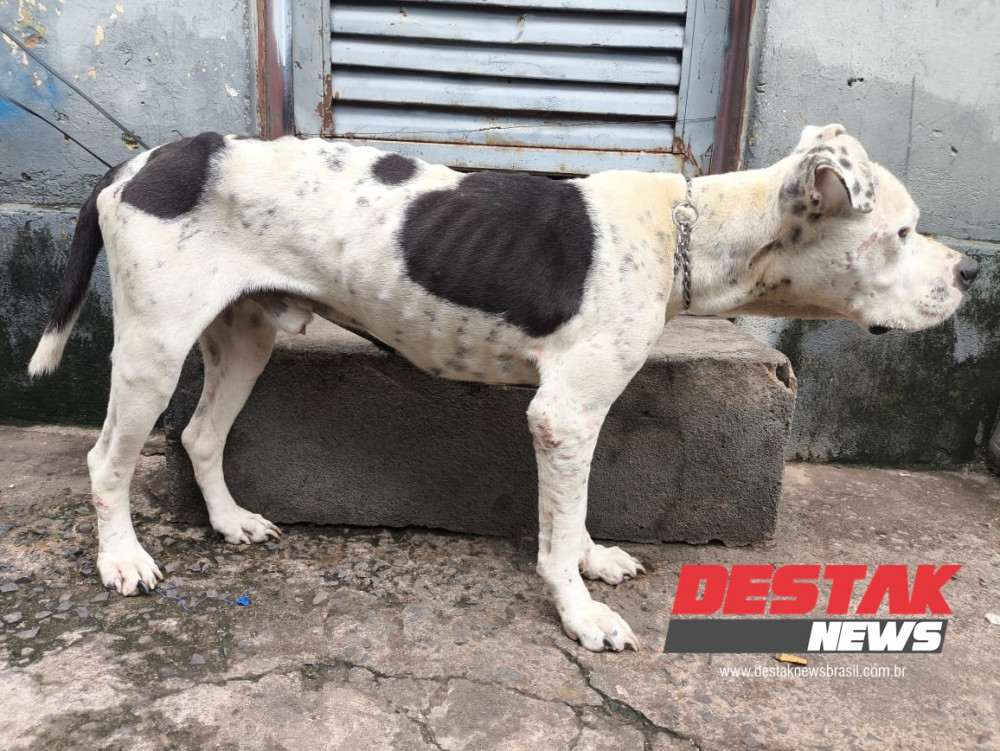 Desnutrição severa: O cão apresentava costelas aparentes e perda de massa muscular.