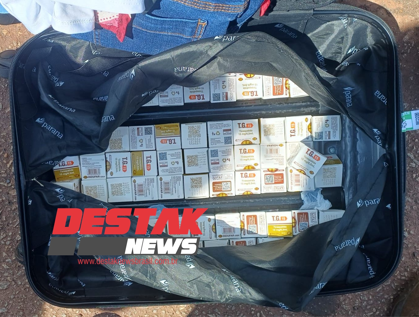 Ao revistar a bagagem, os policiais encontraram um compartimento oculto (fundo falso) onde estavam escondidas 82 caixas do medicamento Tirzepatida T.G 15. No total, foram contabilizadas 328 ampolas da substância.