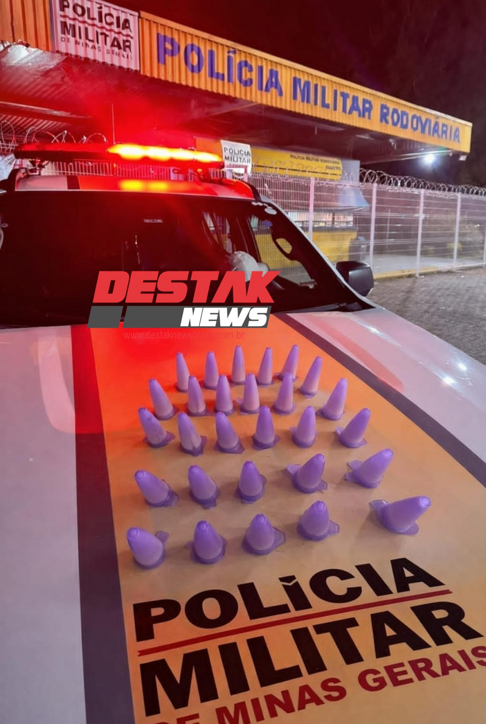 A atitude suspeita dos ocupantes motivou uma busca pessoal minuciosa. Com o passageiro, de 26 anos, os policiais rodoviários localizaram 28 pinos contendo uma substância esbranquiçada, análoga à cocaína, embalados e prontos para a venda.