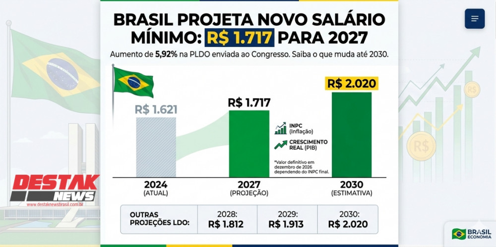 O montante representa um aumento de R$ 96 em relação ao piso atual de R$ 1.621 (reajustado em 6,79% no início deste ano). A variação projetada para 2027 é de 5,92%.