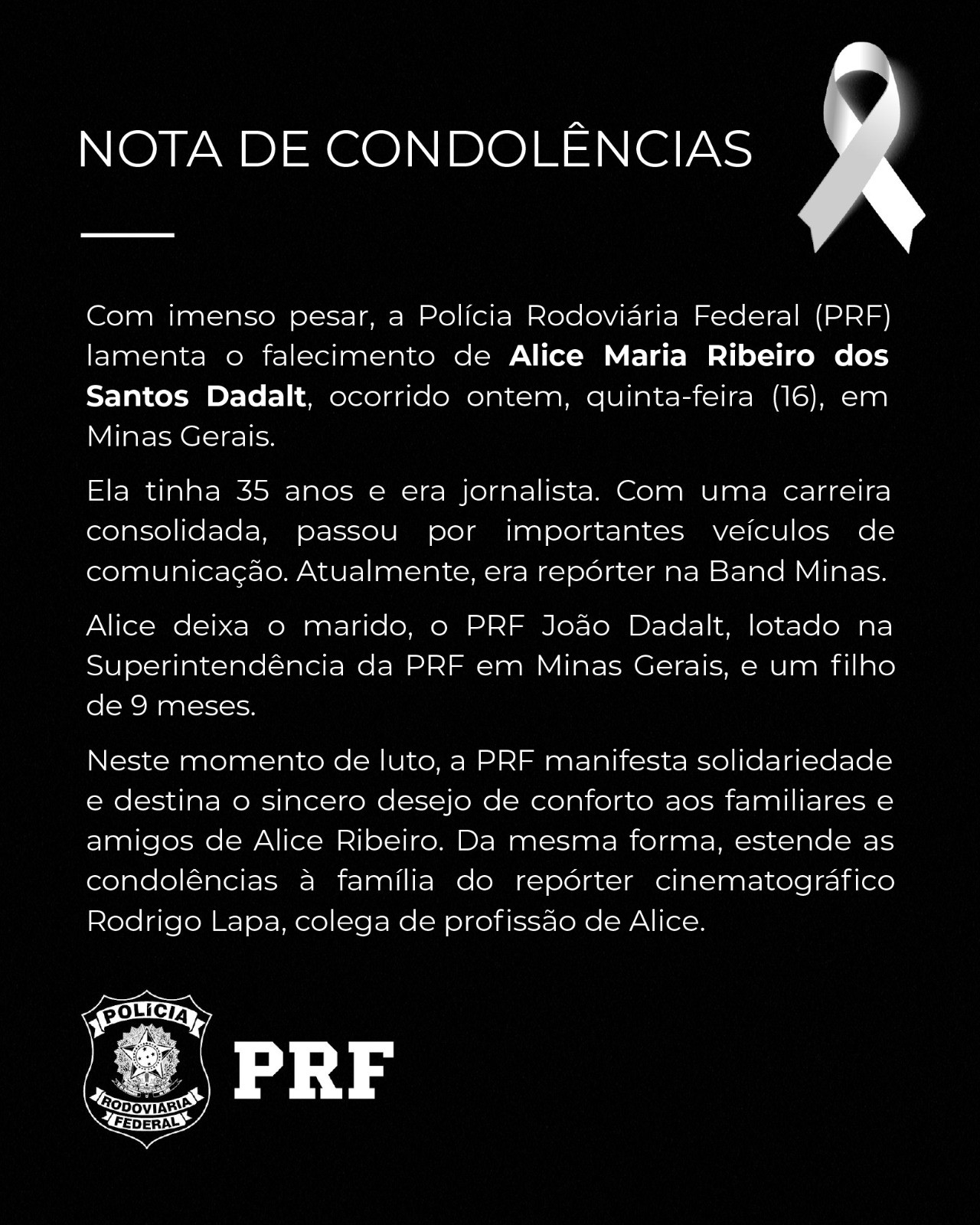 “Com imenso pesar, a Polícia Rodoviária Federal (PRF) lamenta o falecimento de Alice Maria Ribeiro dos Santos Dadalt, ocorrido ontem, quinta-feira (16), em Minas Gerais”, diz o trecho inicial da nota de pesar.