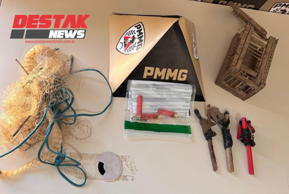 Petrechos de Caça: Os militares apreenderam armadilhas variadas, incluindo tarrafas (utilizadas para pesca predatória) e alçapões para captura de aves.