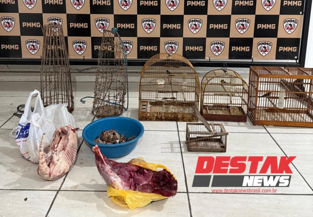 Entre os materiais apreendidos estavam armadilhas do tipo “alçapão” e “jequi”, utilizadas para a captura de espécimes na natureza. No entanto, o que mais chamou a atenção dos militares, foi a localização de um estoque de carne de caça. No interior do imóvel, foram encontradas carcaças e partes de animais silvestres já abatidos, incluindo espécies protegidas como: