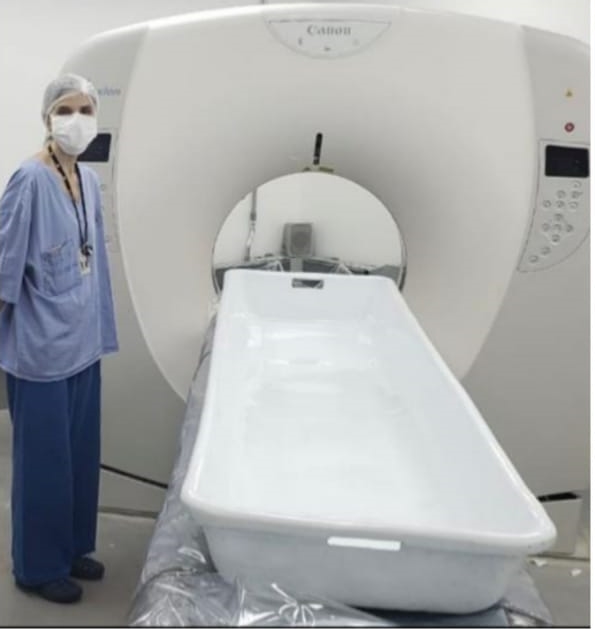 A Médica Legista Adriana Zatti, especialista em Radiologia e Diagnóstico por Imagem, explica que a necropsia virtual é um método utilizado pela PCMG desde a tragédia de Brumadinho, em 2019. O equipamento foi doado pela Empresa Vale com intermediação do Ministério Público de Minas Gerais (MPMG). O exame é utilizado de forma complementar ao tradicional, sobretudo em áreas do corpo de difícil acesso. Quando possível, o Médico-Legista determina a causa da morte por meios externos, não havendo a necessidade da tomografia.